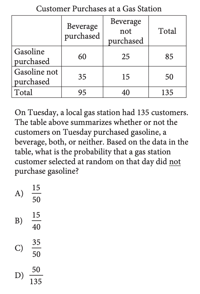 We want the probability that a customer at the gas station did not purchase gasoline. From the table, we can see there were 135 total customers at the gas station, and 50 customers (35 + 15) did not purchase gasoline. So, the probability that a customer did not purchase gasoline is 50 / 135, or Choice D.