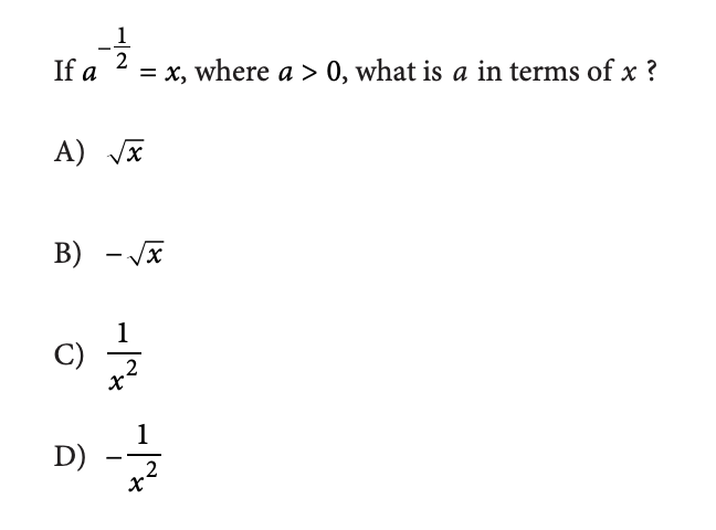 See how we raise both sides to the power of -2, which is the inverse of -1/2? That lets us simplify equation and get a on its own. Then, also remember that if a number or variable is raised to a negative power, that's the same as the flipped version of that number or variable raised to the positive version of the power.