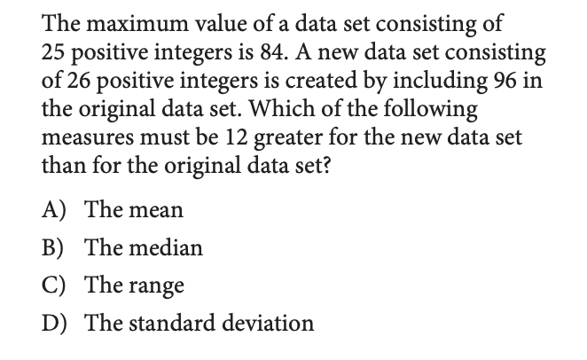 We don't have enough information to calculate each of the choices and see which one is 12 greater. But, we DO know that the range is the difference between the biggest number and the smallest number. In this case, the biggest number is increasing from 84 to 96, which is by exactly 12. So, the range must be 12 greater in the new data set.