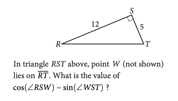 You know that the sum of angle RSW and angle WST is 90, which means that cosine of RSW is equal to sine of WST, giving us an answer of 0.