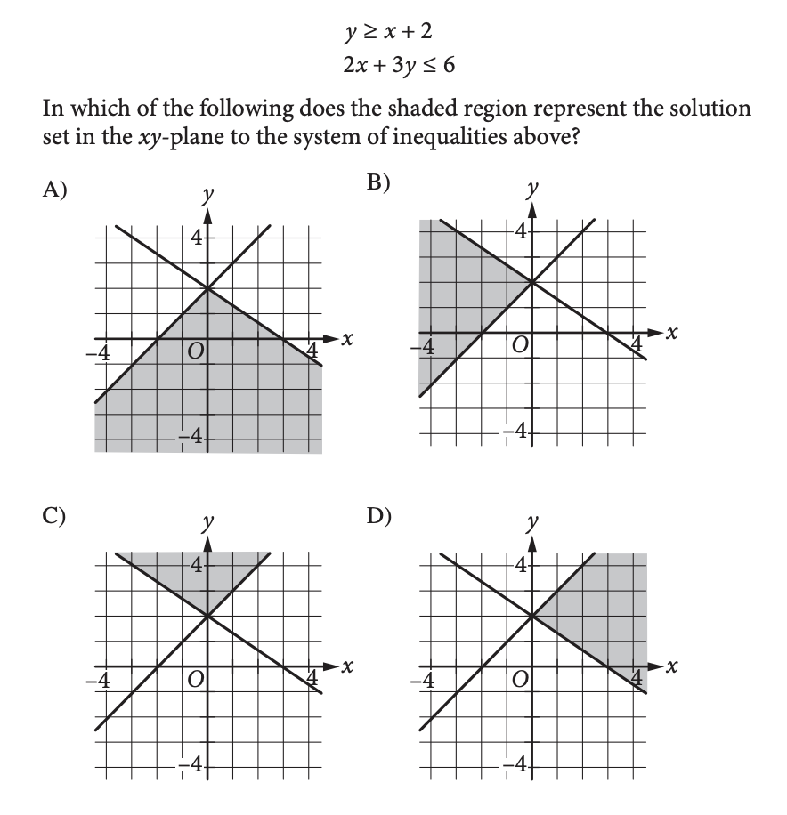 The first inequality must be the line going up and to the right since it has a positive slope. And since y is greater than or equal to the line, the shading must be above the line. The other line has y less than or equal to the line, if we rearrange things, so the shading must be below the line. That makes our answer Choice B, which is the overlap area.