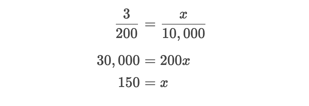 Here, we know that 3 out of 200 cars in the sample had a defect. Using this, we can set up this proportion and estimate the number of defective cars in the larger group: