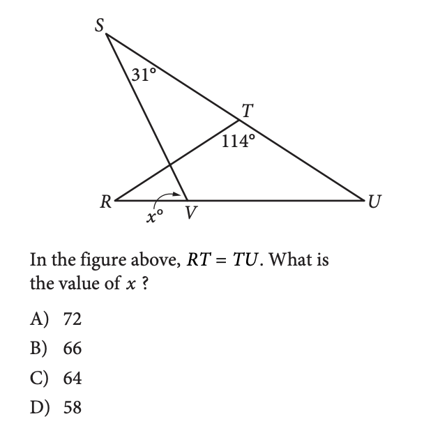 The question tells us that RT = TU, so we know the two green angles are equal, and since they're part of a triangle with angle T, we know they're each 33 degrees. Then, we know the blue angle and angle T are equal to 180 degrees because they're on the same line. So, the blue angle is equal to 66 degrees. Then, we can figure out the purple angle is 83 degrees because the sum of the purple angle, blue angle, and S angle is equal to 180 degrees.